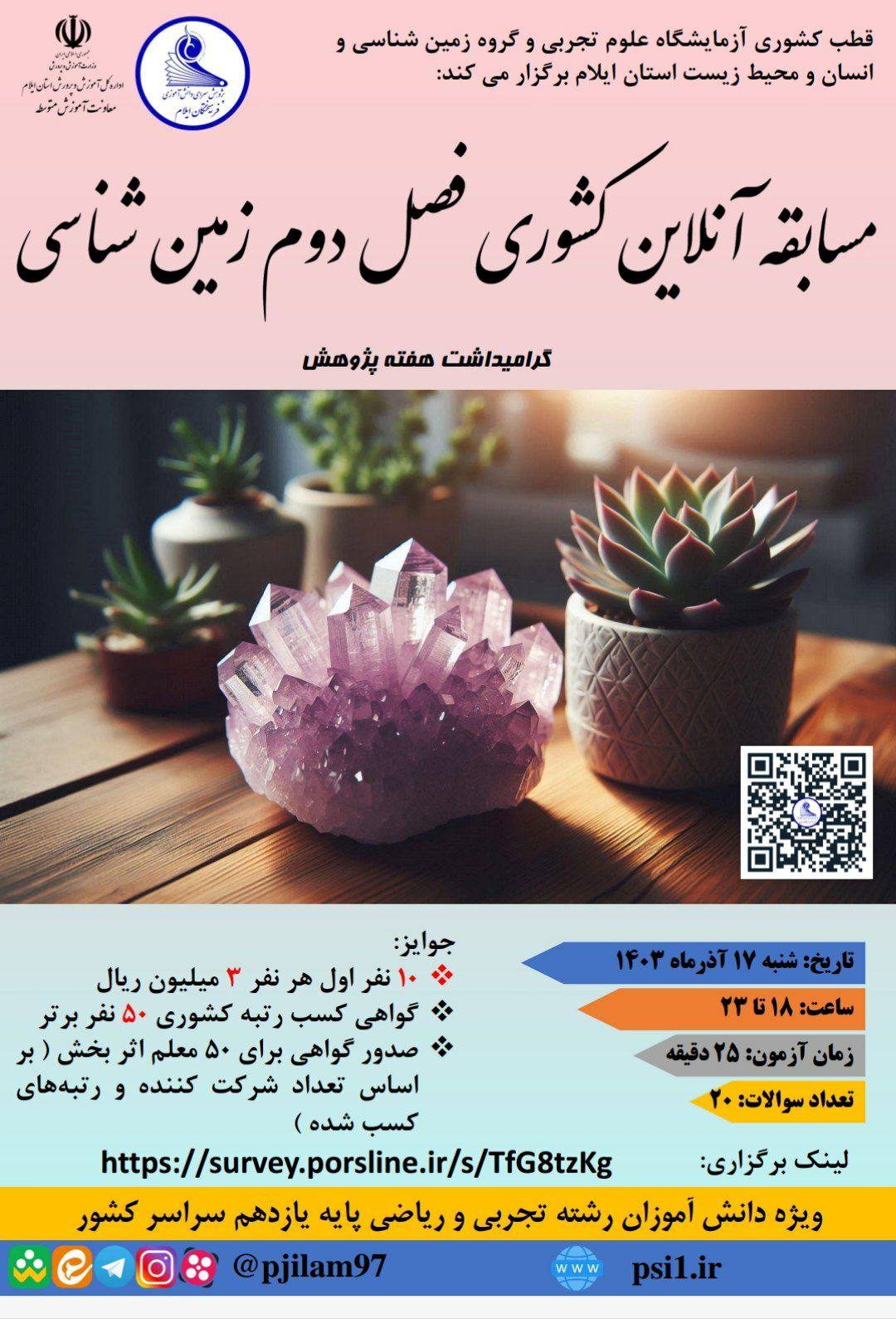 دانلود با توجه به ضرورت افزايش آمادگي دانش آموزان استان ، بهبود کيفيت آموزشي ضروري است که دبيران محترم زمين شناسي نسبت به اطلاع رساني و تشويق دانش آموزان پايه يازدهم تجربي و رياضي به شرکت در مسابقه آنلاين فصل دوم زمين شناسي که توسط گروه زمين شناسي و انسان و محيط زيست استان ايلام برگزار مي شود اقدام نمايند